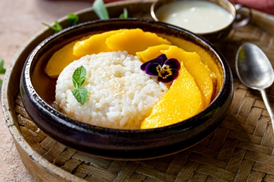 Le riz gluant à la mangue nappé de lait de coco conclut idéalement un repas richement épicé.