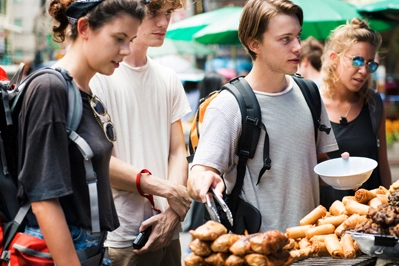 Les stands de street food proposent des brochettes grillées et des salades de papaye verte préparées minute.
